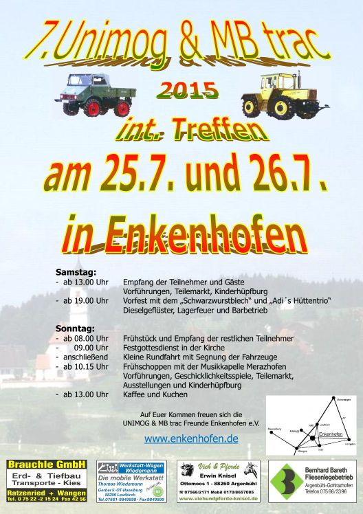 Kennen Sie Enkenhofen? Ich kannte es bis vor 10 Jahren auch nicht. Die kleine Gemeinde feiert am 24-26 Juli Ihr traditionelles Unimog und MB-Trac Treffen und wir sind mit unserem Stand dabei. Wer mal richtig viele MB-Trac sehen möchte, gepaart mit Allgäuer Gemütlichkeit der sollte den Termin unbedingt wahrnehmen!
